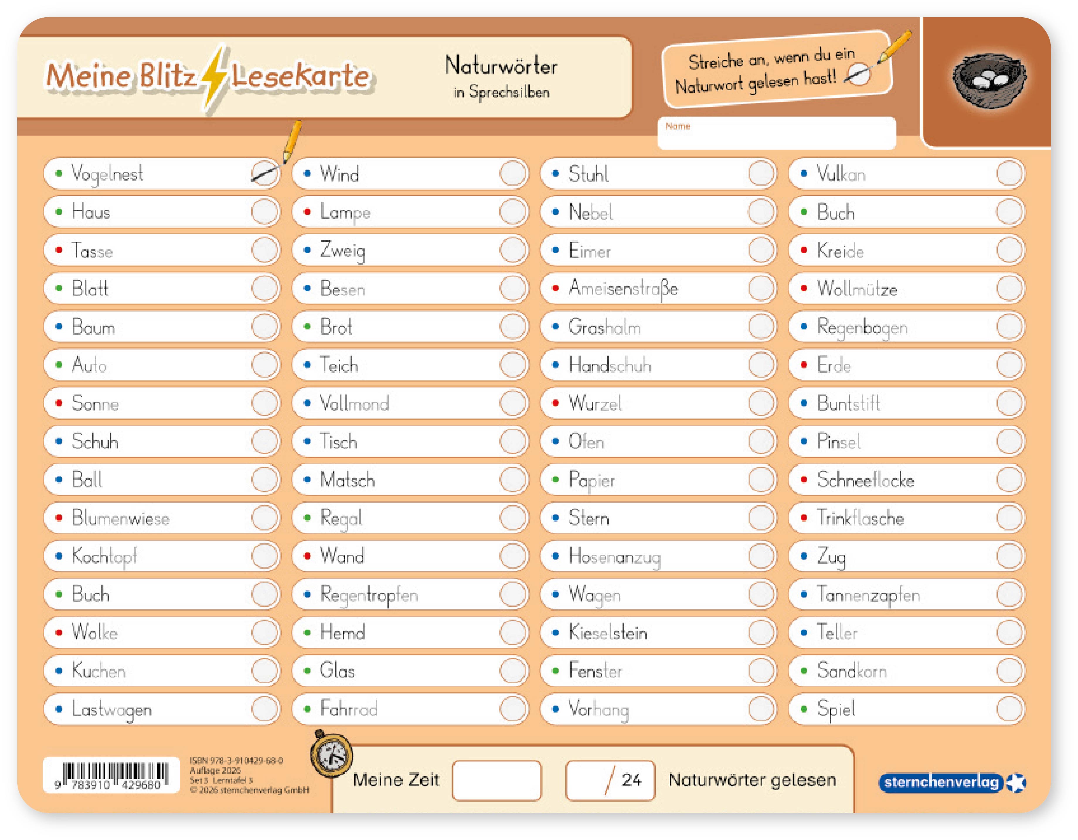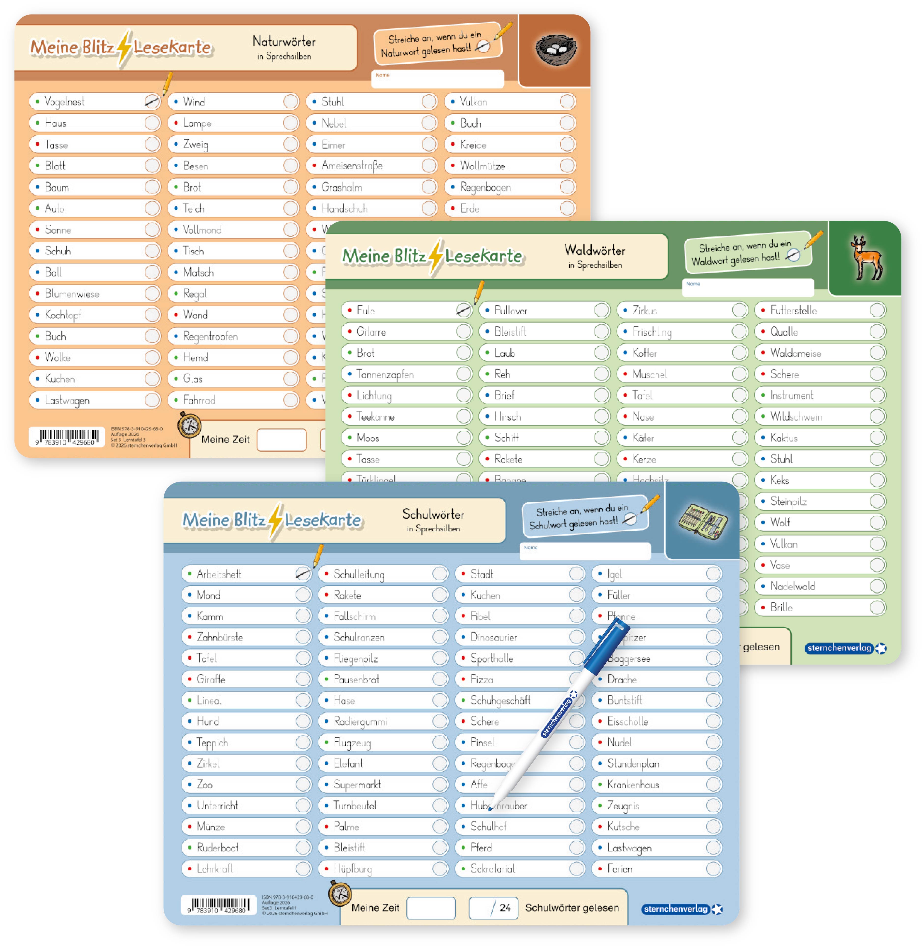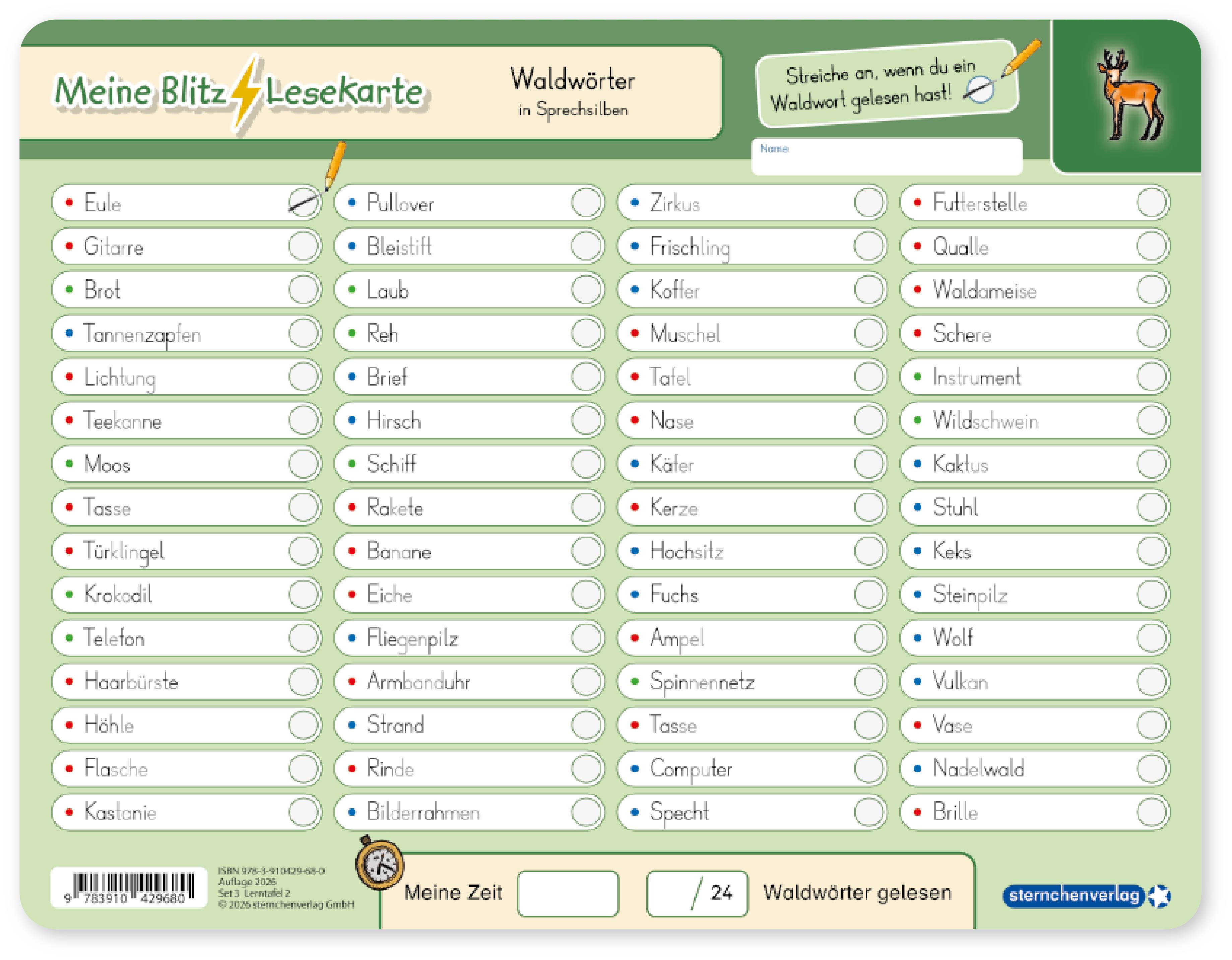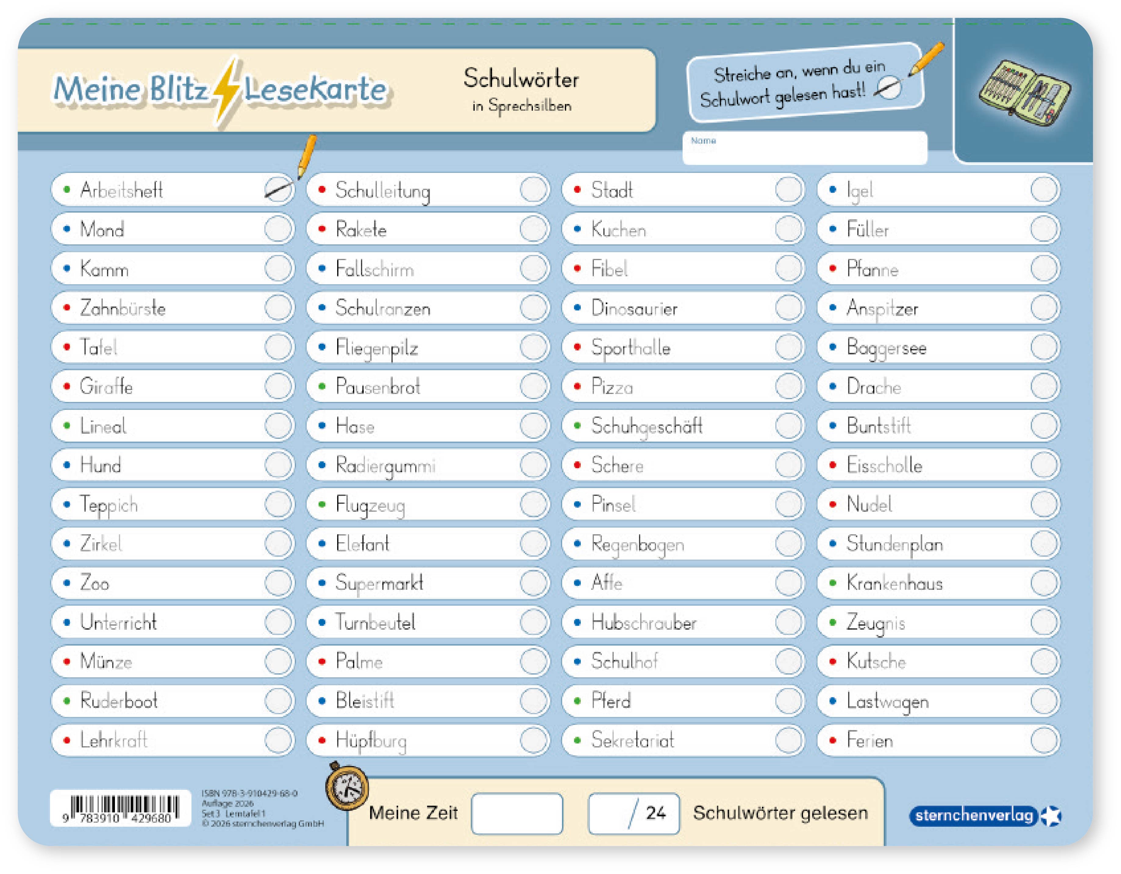Die Kinder erlernen bei diesen Blitzlesekarten das zügige und genaue Lesen. Jeweils 60 Wörter mit 24 Themenwörtern beinhaltet die Lernvorlage. Durch konzentriertes Lesen auf der ersten Seite soll das Kind die richtigen Wörter anstreichen. Am Ende kann das Kind immer wieder seine Bestzeit und die Anzahl der gefundenen Suchwörter in die vorgesehenen Felder eintragen. Auf der Rückseite schreiben sie die gefundenen Wörter mit dem beiliegenden Stift auf. Die Blitzlesekarten schulen das Leseverstehen sowie das flüssige und aufmerksame Lesen. Praktisch und sauber, trocken abwischbar, ohne zu schmieren und ohne Farbrückstände.