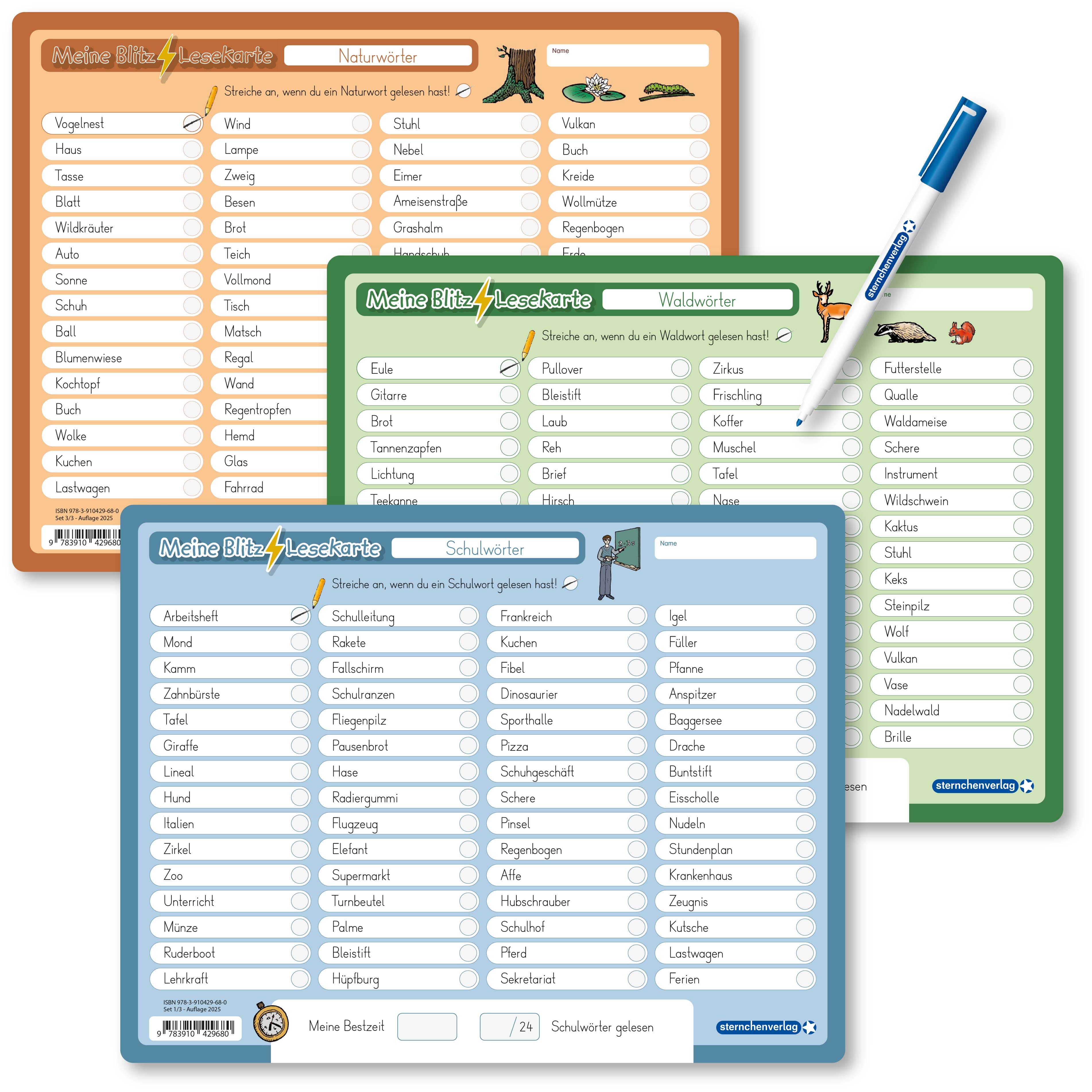 Die Kinder erlernen bei diesen Blitzlesekarten das zügige und genaue Lesen. Jeweils 60 Wörter mit 24 Themenwörtern beinhaltet die Lernvorlage. Durch konzentriertes Lesen auf der ersten Seite soll das Kind die richtigen Wörter anstreichen. Am Ende kann das Kind immer wieder seine Bestzeit und die Anzahl der gefundenen Suchwörter in die vorgesehenen Felder eintragen. Auf der Rückseite schreiben sie die gefundenen Wörter mit dem beiliegenden Stift auf. Die Blitzlesekarten schulen das Leseverstehen sowie das flüssige und aufmerksame Lesen. Praktisch und sauber, trocken abwischbar, ohne zu schmieren und ohne Farbrückstände.
