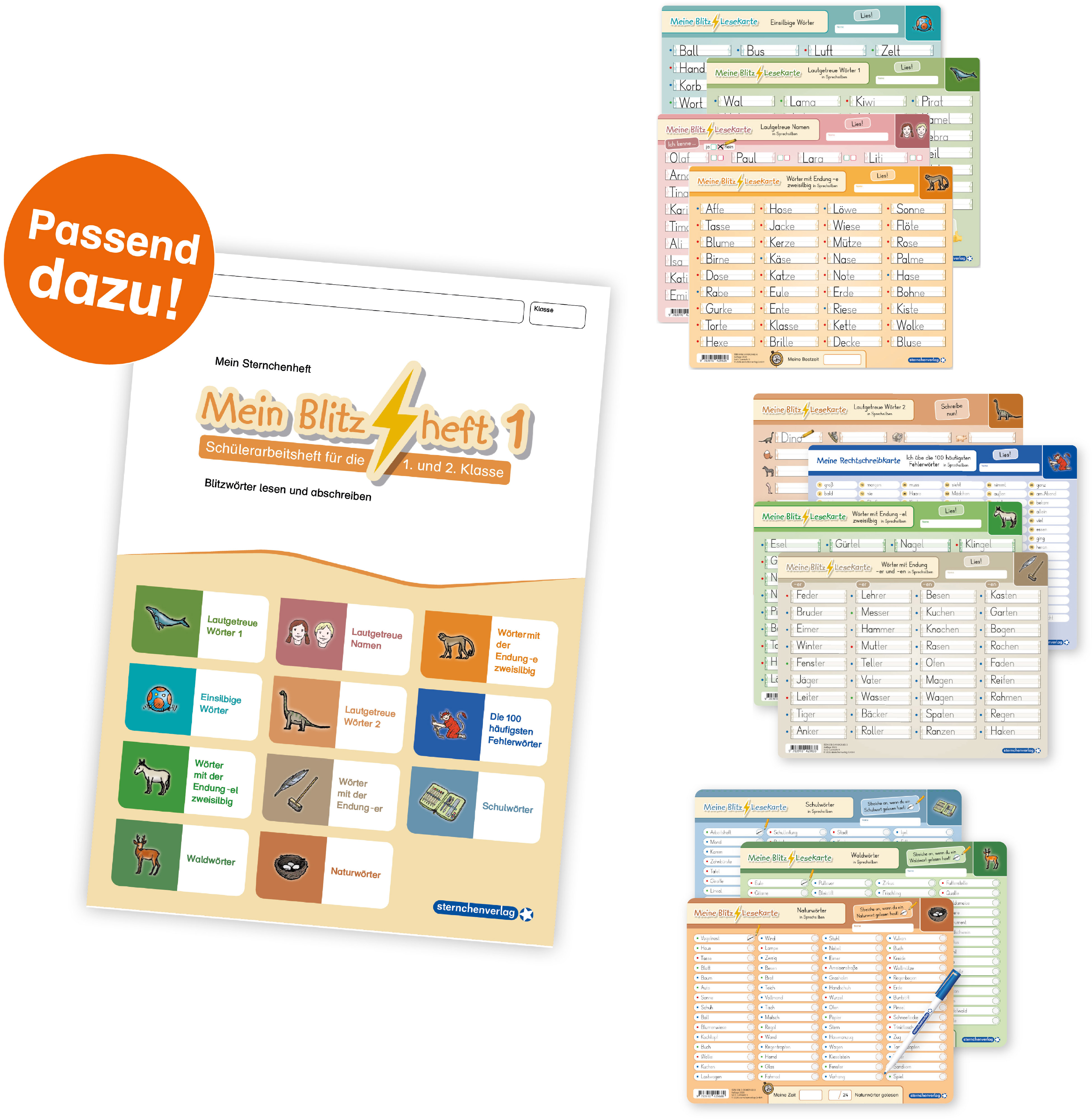 Im Sternchenheft "Mein Blitzheft 1" lesen und schreiben die Kinder vorgegebene Blitzwörter ab. Hierbei wird Wert auf das genaue Abschreiben gelegt. Dies erfolgt in unterschiedlichen Varianten und Schwierigkeitsgraden. Passend zu diesem Heft sind auch Lerntafeln erschienen, bei denen es verstärkt um das Erlesen von Wörtern geht. Beide Materialien, Heft und Lerntafeln, können zusammen bearbeitet, aber auch unabhängig voneinander eingesetzt werden.