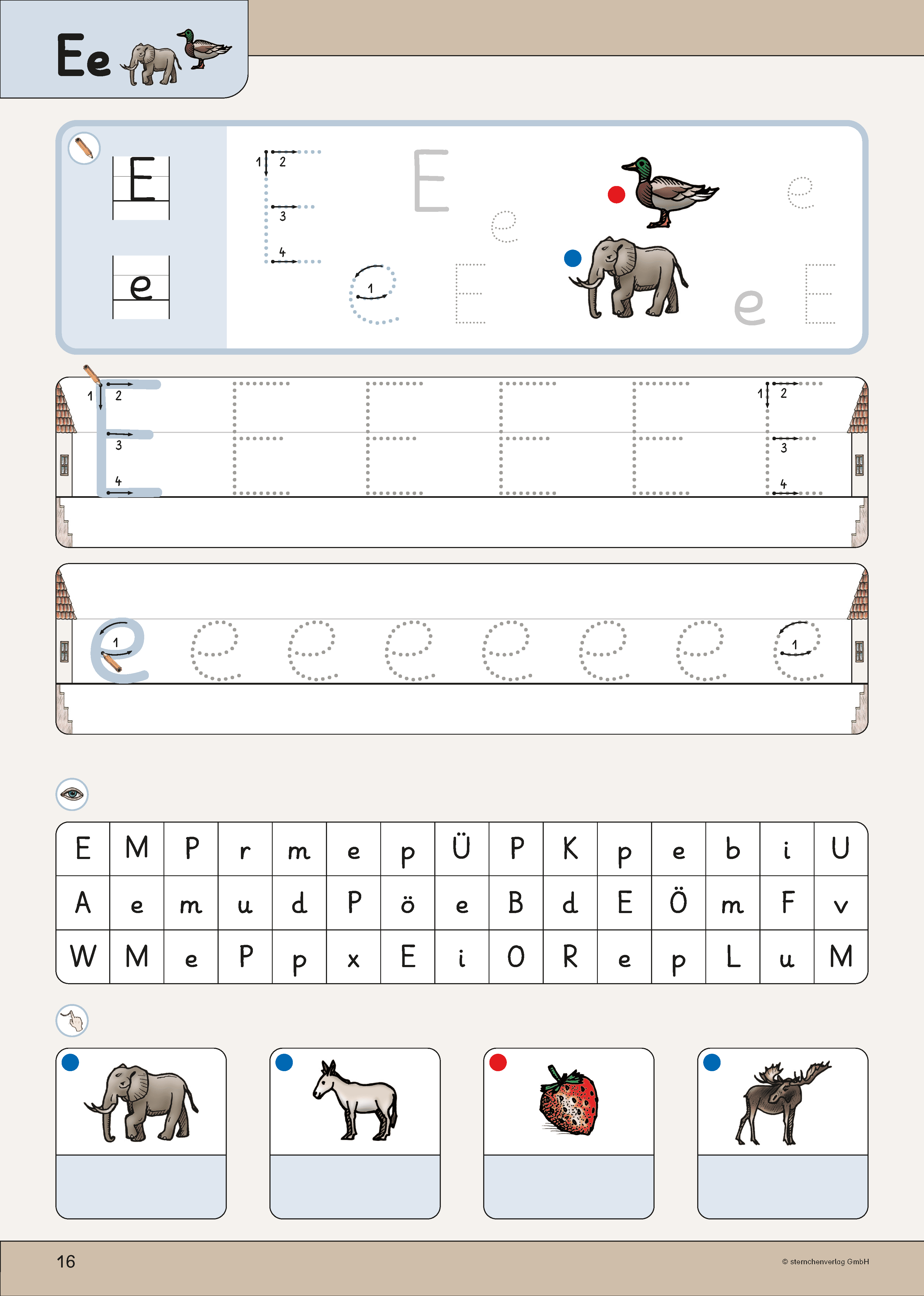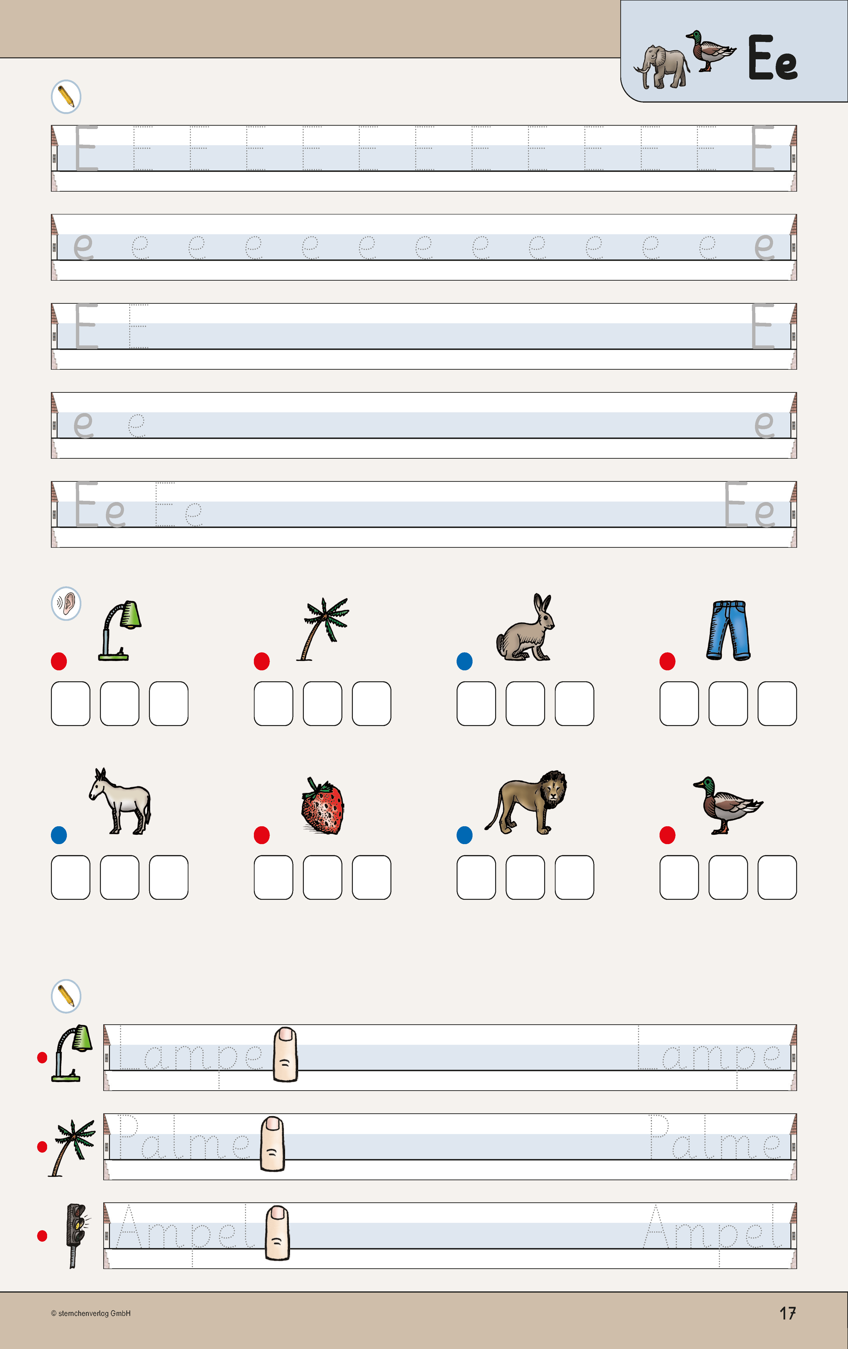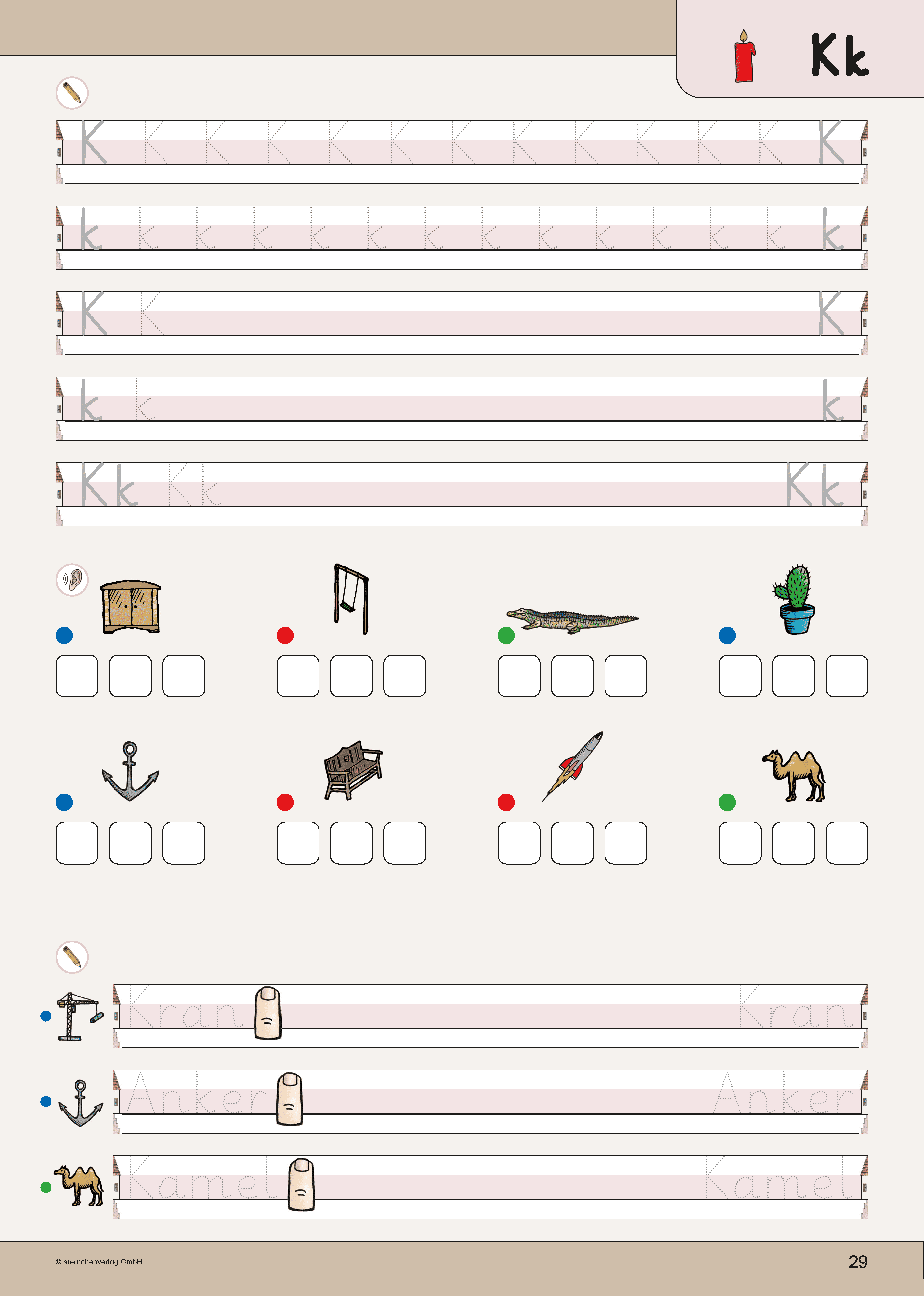 Die Anlautbilder entsprechen der Anlauttabelle für den "Druckschrift- und Grundschriftehrgang" sowie dem Arbeitsheft "Übungen zu den Anlauten".